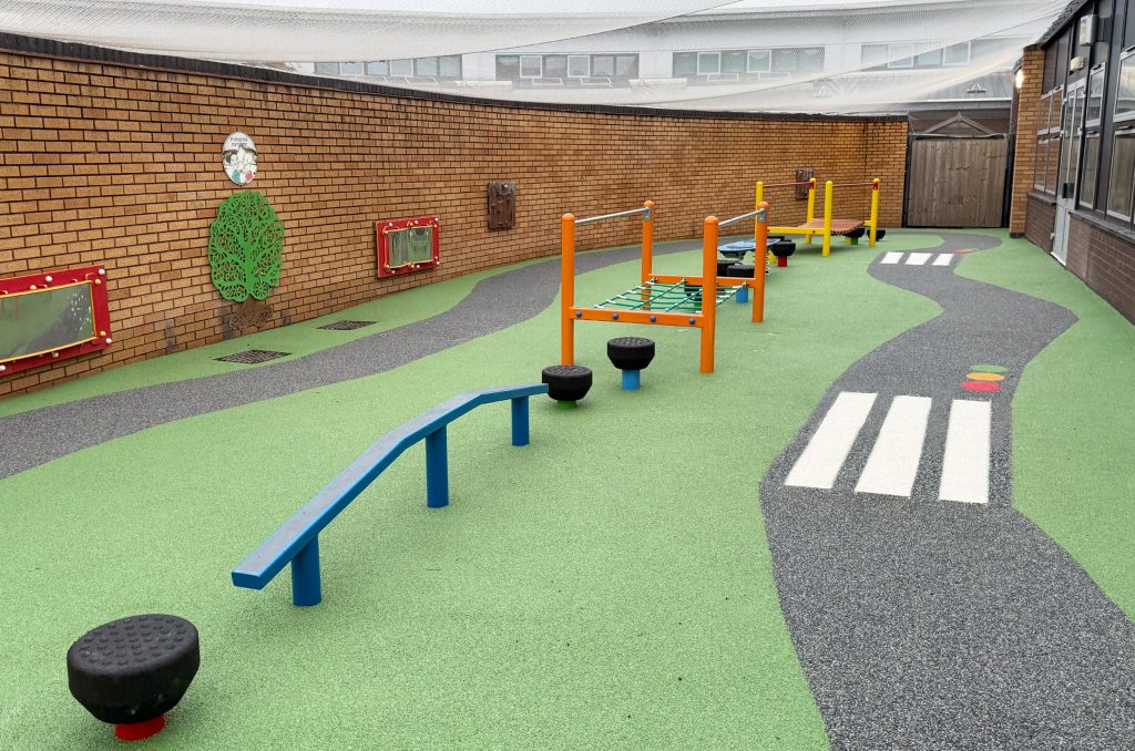 Installation of coloured wet-pour surfacing, enhancing safety and adding sensory appeal through colour and texture.